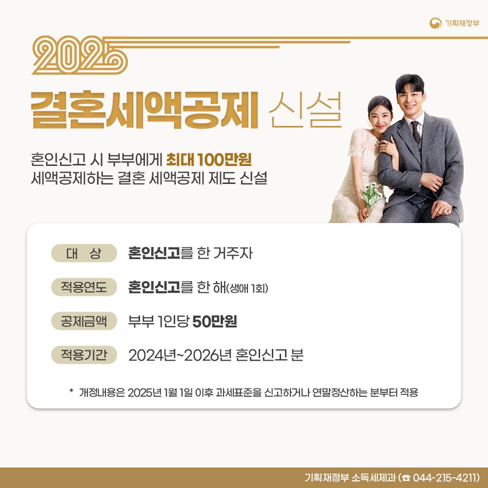 - 결혼세액공제는 2024~2026년 혼인신고분 대상, 부부 각자 50만 원씩, 총 100만 원 공제가 가능합니다